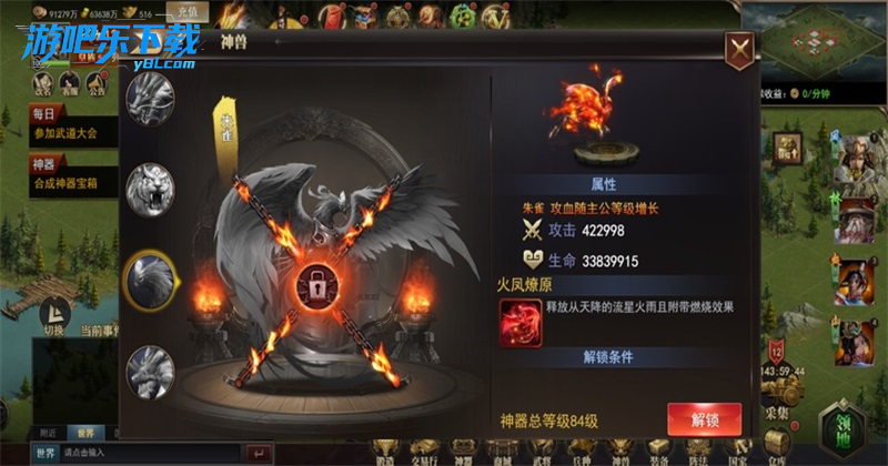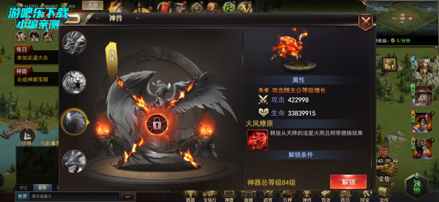 进入神兽界面,满足解锁条件后解锁朱雀等神兽,获取属性加成;