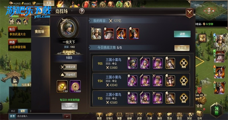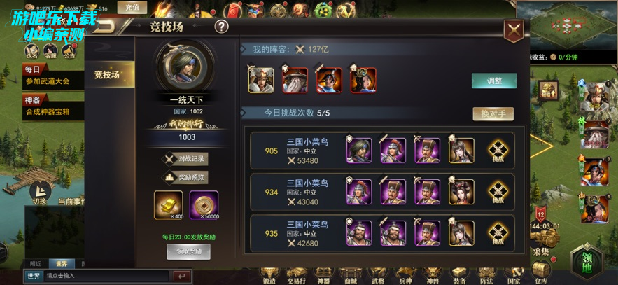 进入竞技场,调整阵容后挑战对手,积累竞技积分;