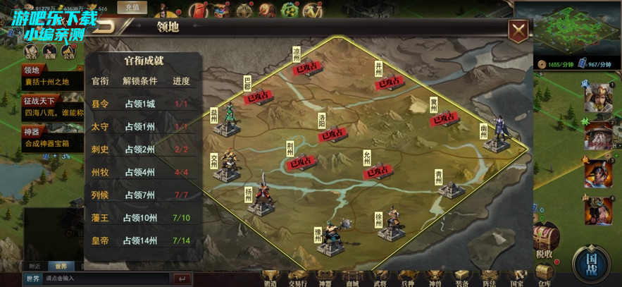 进入领地界面,占领对应城池/州,推进官衔达成进度;