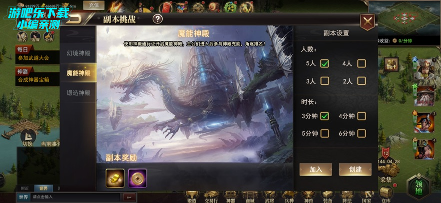进入副本挑战界面,选择“魔能神殿”,设置人数、时长后创建/加入副本;