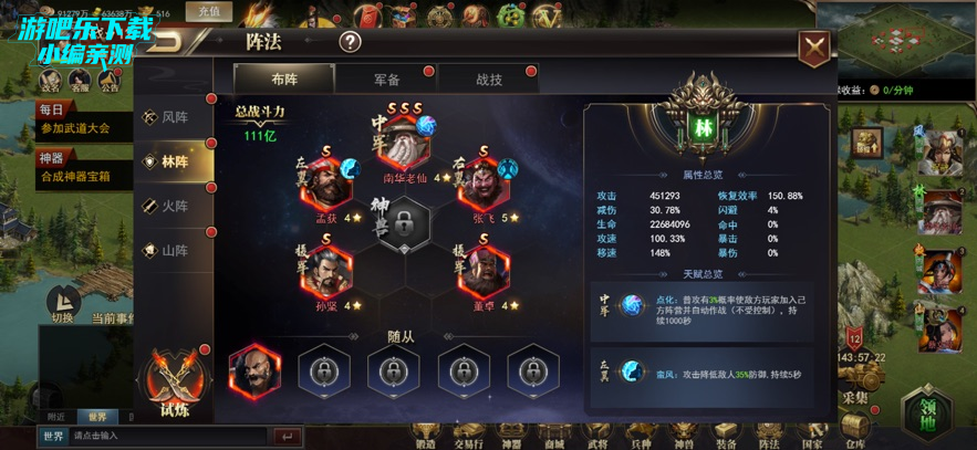 进入阵法界面,选择林阵等阵型,搭配武将布置阵容,提升战力;