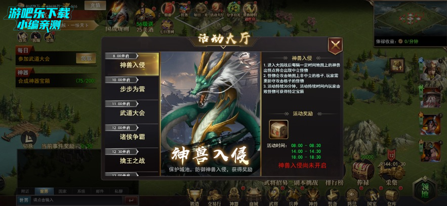 进入活动大厅,选择“神兽入侵”等活动,按规则参与并领取奖励;