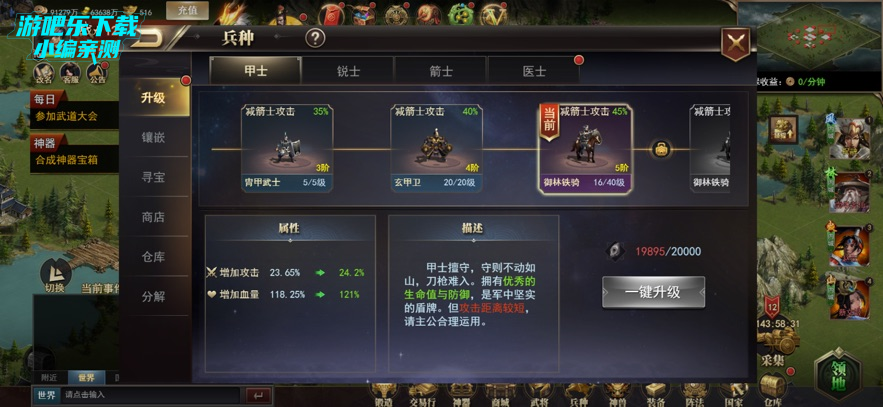 进入兵种界面,选择甲士等兵种,点击“一键升级”提升兵神等级与属性;