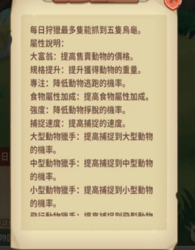 每天狩猎可以抓到5只乌龟,每只乌龟出售可以获得2点晶石。其他的动物出售都可以获得狩猎币。也可以放入动物园增加属性,同一种动物可以反复捕获,通过重量决定属性的大小。