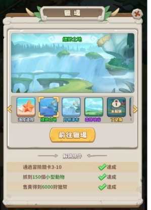 小原人们已经做好了捕捉道具准备抓各种小动物了,左上角显示的分别为体力、狩猎币与晶石,每5分钟自动回复1点体力,上限为200,到达上限后不再继续增加,所以小原人们要注意哦。狩猎币用于升级动物园以及购买商店道具(强烈不建议),晶石用于升级狩猎道具。