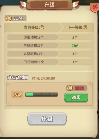 获得的狩猎币可以用于升级动物园,增加动物园动物的数量。其中