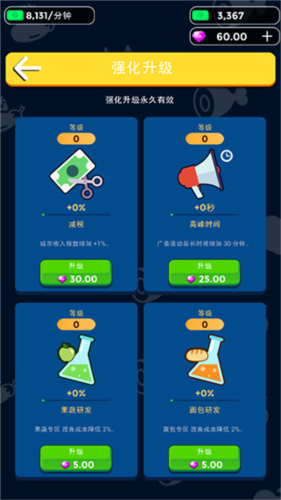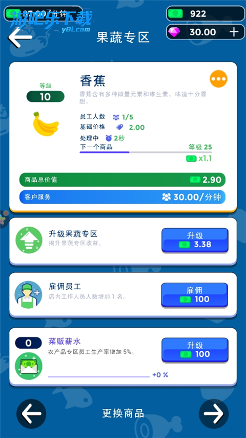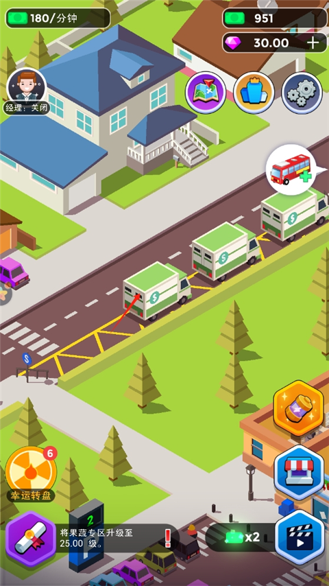 刚进入游戏我们只有一个果蔬专区、一个收银员,而且收银的速度也非常的慢,这个时候就需要玩家进行升级了;