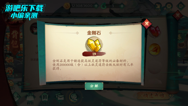 2、金刚石是用于铸造提高妖灵道符等级的必备材料使用200000级 (含)以上妖灵道符击败大妖时有几率获得。