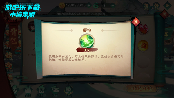 7、凝神:使用后凝神聚气,可无视妖物阻挡,直接攻击指定的妖物,略微提高击败概率。