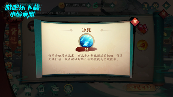 5、冰咒:使用后使用冰咒术,有几率冰封住附近的妖物,使其无法行动,攻击被冰封的妖物略微提高击败概率。