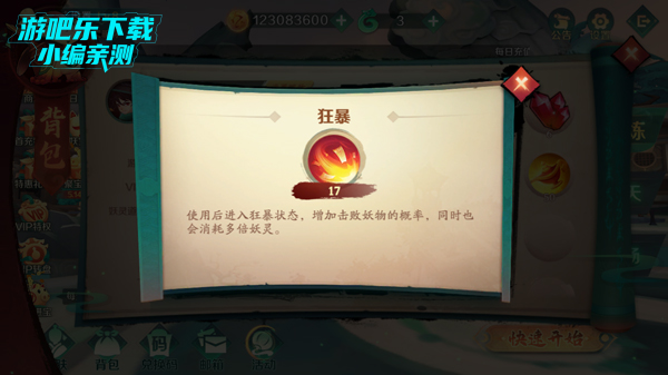 6、狂暴:使用后进入狂暴状态,增加击败妖物的概率,同时也会消耗多倍妖灵。