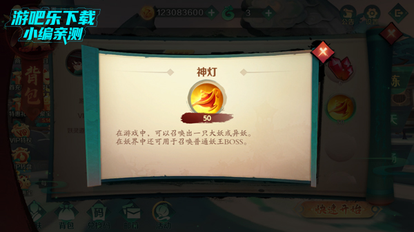 8、神灯:在游戏中,可以召唤出一只大妖或异妖。在妖界中还可用于召唤普通妖王BOSS。