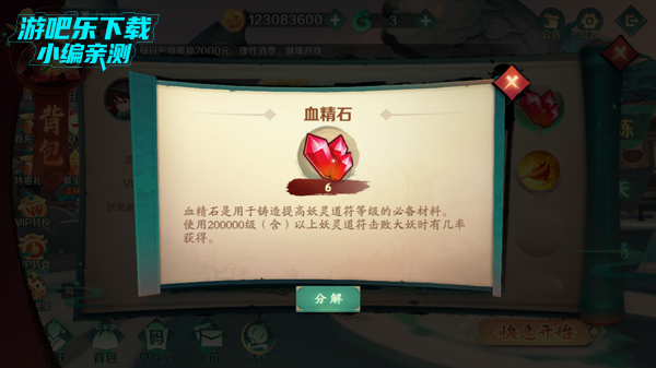 4、血精石是用于铸造提高妖灵道符等级的必备材料。使用200000级 (含) 以上妖灵道符击败大妖时有几率获得。