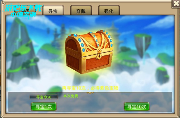 4、寻宝:分寻宝1次和寻宝10次,寻宝会消耗寻宝令,或者可以消耗250元宝,而且每48个小时会免费给玩家寻宝一次,寻宝10次后必得紫色宝物。寻宝10次是方便玩家多次寻宝,快速找到自己需要神兵和法宝