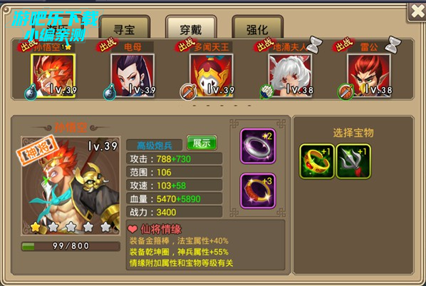 宝物即神兵、法宝,相当于一种特殊的装备,宝物系统是塔防西游记里面最有趣的一个玩法之一,他包含了三部分的内容:游历、寻宝、穿戴强化。