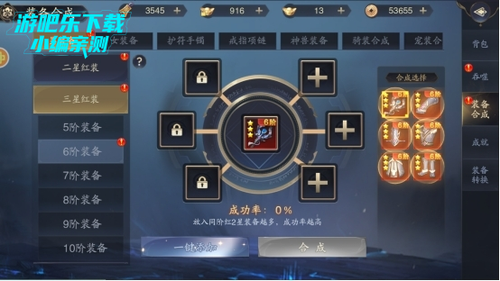 以上方式获取的装备基本为一星或者二星的装备,而套装任务要求的是三星装备,甚至是四星装备。而想要给装备升星就需要进行装备合成,不同品阶的装备需要的装备件数不同,8阶开始就不需要全部上满(以防万一还是满成功率比较好)