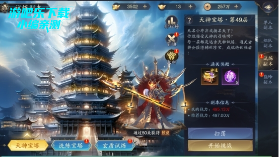 天神是本款游戏pve最重要的一个玩法,天神能够给我们带来海量战力,不仅如此,在pve时我们能够变身成天神,获得超额免伤以及超额攻击,帮助我们更加简单快速地击杀BOOS。天神的获取零氪主要是天神试炼以及天神宝塔,七日活动获取。天神宝塔主要产出进阶丹以及神通。