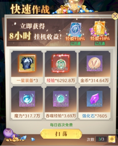 闯关扫荡:左下角自动闯关,每日可以快速扫荡三次,根据SVIP等级可以额外购买次数,每日凌晨五点刷新次数。层数越高,快速作战获取的经验越高。(经验副本和快速作战都是每日凌晨五点刷新次数。熬夜的小伙伴可以每天十二点之后先充值提升一下战力,然后再去打,这样可以最大化经验收益!)