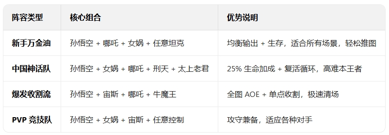 1. 全能型阵容:女娲 + 宙斯 + 路西法 + 海拉 + 孙悟空
