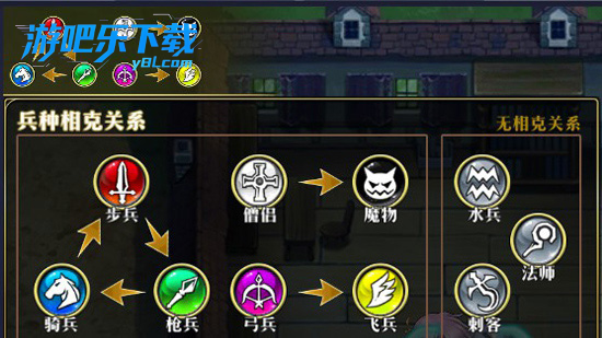2、步兵、骑兵、枪兵三种基础兵种相互克制,飞兵,刺杀者、僧兵等在面对特定的敌人时可以发挥巨大的威力,不同的兵种之间配合作战,其作用远大于单一作战。魔物虽然没有对应的克制对象,但其通常拥有特殊的能力,如无限增殖的史莱姆、召唤幽灵的尸人。