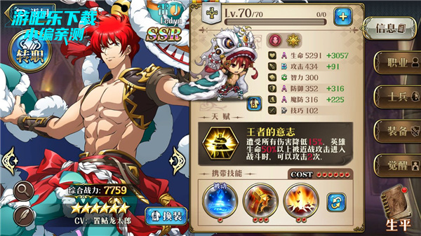技能:剑魂、迎头痛击、超绝、大喝、[破甲、压制]共6个核心技能。