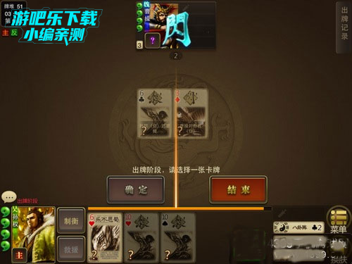 2、首先分给主公“曹操”、“刘备”、“孙权”另外随机抽取的2张武将牌,一共5张武将牌,由主公玩家挑选一个武将扮演。随机发给其余每位玩家各3张武将牌,挑选一张扣在自己面前,待所有玩家都挑选好后同时亮出。