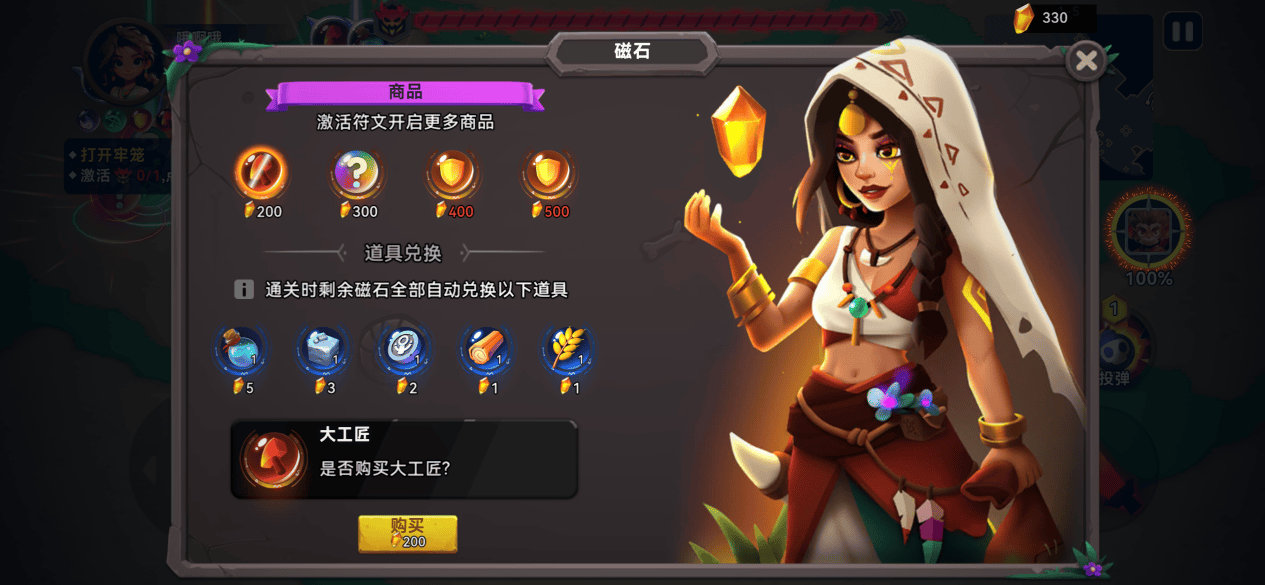 每轮关卡将由出没于部落的神秘商人全程提供局内商品选购,玩家可使用磁石(局内获得)购买祝福技能使用道具,购买成功后即可获得商品的对应祝福效果。