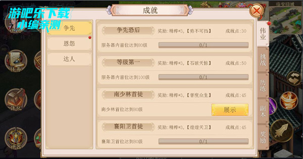 成就分伟业、挑战、副本、成长四个大类,每个类别下又分若干子类成就;