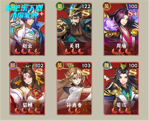 1、赵云+关羽+周瑜+貂蝉+孙尚香+荀彧