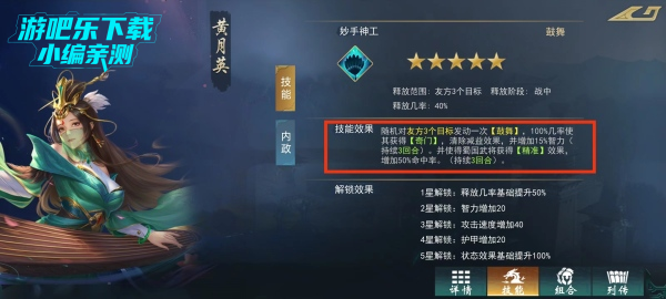 作为蜀国为数不多的方士,计谋〔妙手神工〕十分强力,不仅能清除减益状泰还能增加智力和命中,提升物害输出,若此技能和其夫君诸葛亮一起上阵的话,能大大地提升武将的发挥。