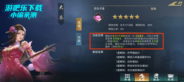 是一名恢复型辅助,主要作用是在战场上恢复伤兵,从而让这些士兵能够重返战场。虽然大乔的奶量十足,但是释放概率稍低,粮布按能本身是持续性技能,只要覆盖上一次即可持续较多的回合,配合枪兵还能多方面增加其武将,武力,智力,护甲和闪避等属性可以提升武将的输出和生存能力。