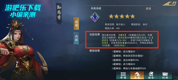 虽然是位女武将,但是她的武力,智力,速度都偏高。而且她的武技〔飒爽枭姬)可以强化普攻伤害,却也十分依赖连击率,在进行普攻后,有30%的概率对敌方发动一次武技,并且武技能减免自身受到的伤害和恢复受到伤害量的兵力,提升持续作战能力。