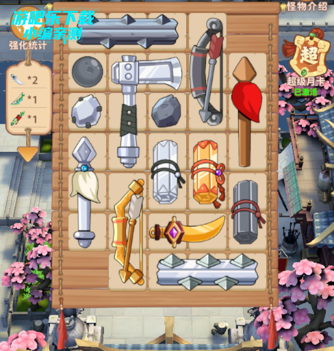 武器的类型共有八种,分别是飞斧、长枪、石头、长弓、雷术、短刀、滚木、夜光珠,大部分的武器所需占用的格子数不同。如飞斧所占用的是“倒7”字型的格子,对此开局随机到飞斧的话,建议用飞斧和雷术、石头、夜明珠搭配,这样子可以最大化利用格子。