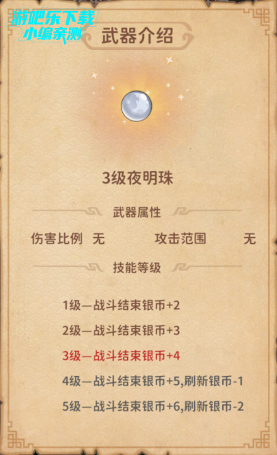 从武器效果上来看,夜明珠是属于辅助性武器,不具备任何伤害效果,但是可以提供银币收益以及降低刷新硬币的消耗,所以不适宜太多,适量就好,后期硬币数量足够的情况下,甚至可以考虑替换成石头。