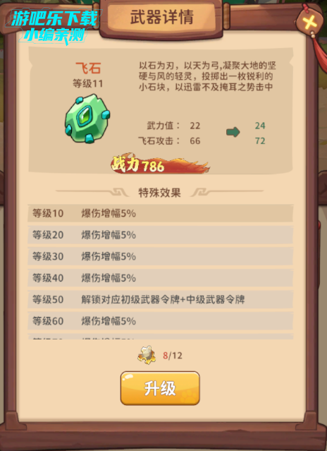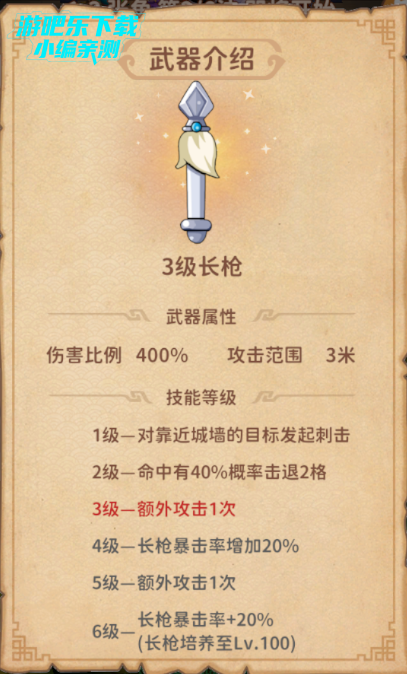 每次通关可以获得一定数量的“武器”碎片,除了夜明珠外,其余武器可以在武器界面进行升级。武器升级后可提升攻击,达到一定等级还可以解锁武器令牌以及触发对应系的武将技能。