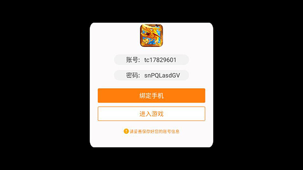 2、游戏将自动为玩家创建一个游戏账号,记住账号和密码,之后可以在游戏设置中进行更改;