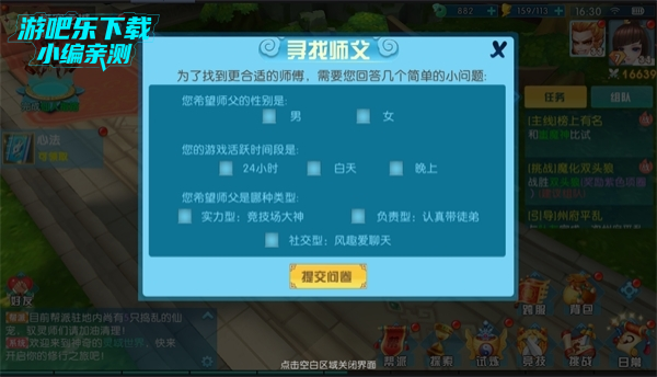 寻找师父需要先找到师徒指引NPC,为了找到心仪的师父,当然少不了填问卷了,只需要填你的要求就好啦~当然,如果你已经有师父了,只需要与师父组队到师徒指引NPC这进行拜师仪式就行了。