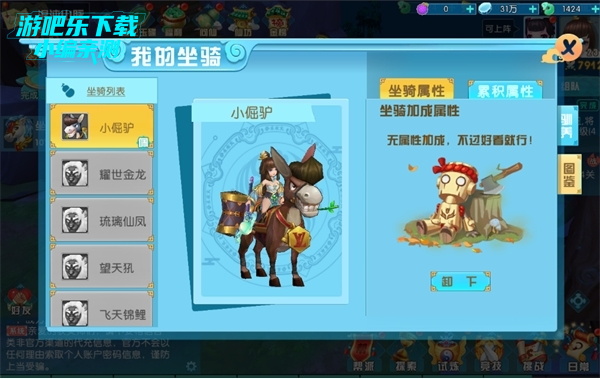 当然,第一个获得的坐骑没有属性加成,但只要好看就行啦~看这小倔驴是不是很萌~