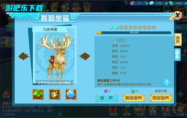 游戏中的坐骑有阶段之分,不同的阶段会有不同的外形显示,当然,想要提升阶段就需要对坐骑进行培养了。通过消耗仙宠果就能给坐骑增加经验,经验满级时会自动升星,玩家可获得的属性加成也会随之增加,一旦经验达到升阶,坐骑就会进阶,同时外形也会发生相应的变化哦,想要好看的外形,就快去培养你的坐骑吧。