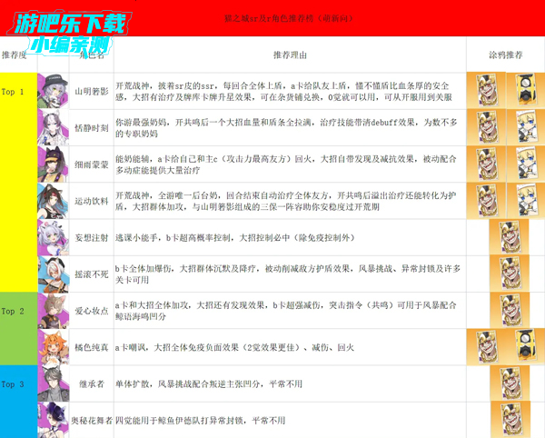1、SSR角色强度榜一图流既包含角色总评级,亦包含角色分榜T度,如风暴挑战,爬塔,涂鸦本,异常封锁以及萌新开荒,还包含角色觉醒共鸣涂鸦以及培养优先级推荐,附带角色说明。