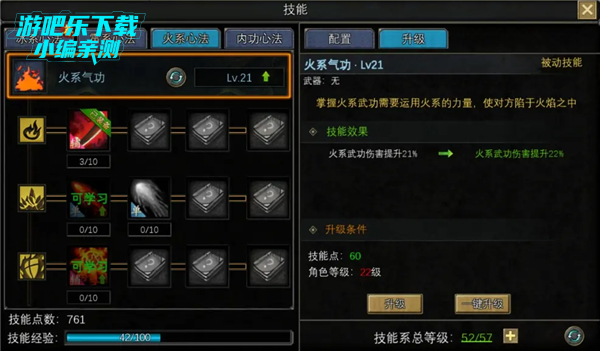 物理攻击与魔法防御兼备火系气功注重物理伤害加成和魔法防御,充满攻击性。运转火之气息可永久提升物理伤害,搭配大刀武器,能冲锋陷阵击退敌军,同时较高的魔法防御使其不惧魔法型敌人。