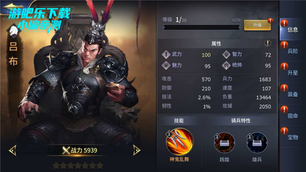 英雄池:涵盖百名三国名将,支持升级、升星、装备、宿命、宝物等多维养成,每个模块提升均可大幅增加战力。