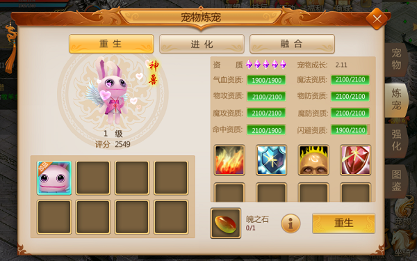 使用魄之石对宠物进行重生,会洗掉宠物的强化效果和属性。