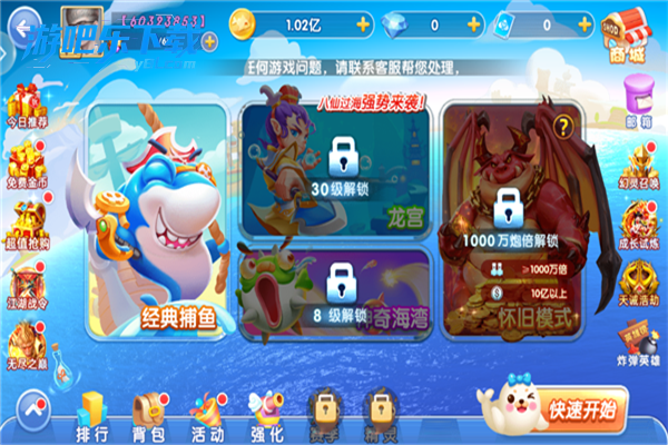 选择渔场:从龟相迎宾场入门,完成任务解锁高阶渔场。