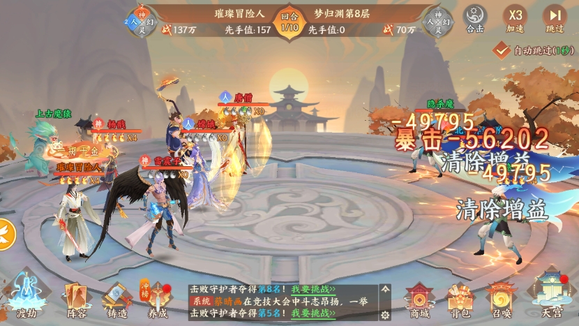 上位阵容:这套阵容的核心在唐僧和猪八戒的套盾和清buff,雷震子是相柳的上位替代,不仅群奶还能减伤,提供更好的输出环境,然后靠杨戬、应龙快速收割,将敌方的主力输出一波带走,迅速减员。
