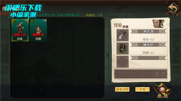 在对话完成,并回屋子休息后。即可进入初次的战斗演练阶段。选择武将出战,可以选择自由探索以及战斗指挥便于快速上手!