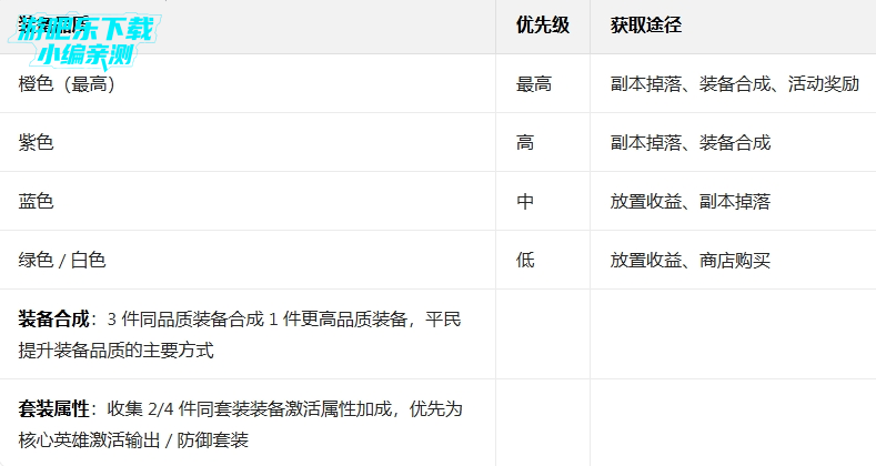 装备优化:为核心英雄穿戴最高品质装备,激活套装属性,提升效果超过英雄升星