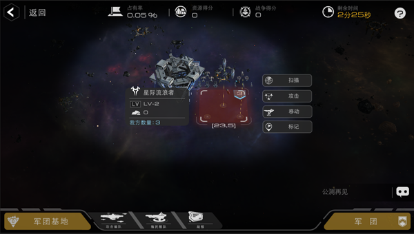 2、我们注意到在空间机库的左下方多了几个阵型按钮,我们可以先使用1号阵型,在前3个位置上放肉盾,后3个位置上放输出。添加好了编队我们就可以开始进攻了,点击空白的地块会显示该地块的信息,我们先把编队移动过去,到达目标点后我们就可以点击攻击了。