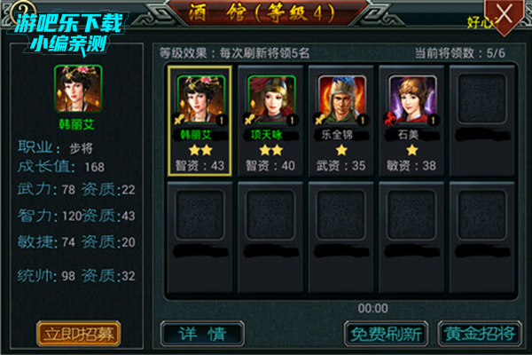 进入游戏,你会发现自己有一个君主,一个成长350+的将领,由于将领是随着自己等级提升慢慢升起来的,后期招将很难替换,而且如果不是我运气太背着,系统应该是在酒馆等级低,只能刷新出两三个将的时候后刷新最容易出黄紫将,到后期可以一次刷新六七个将的时候几乎看不到好将了。所以,前期自己想有好将一定要在酒馆等级还低的时候,用黄金多刷几次,留下370以上的黄将,以后培养几次就会成紫将。