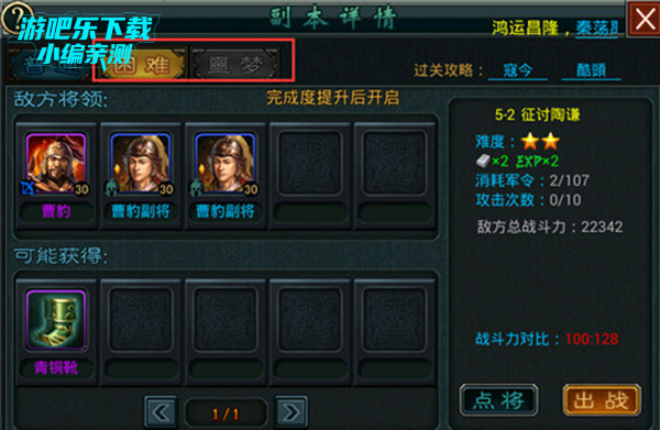 因为将领的等级不能比君主的等级高,所以升级在游戏里表现得就极为重要了,获得经验最多的当然是主线任务。但是当你发现你打不过主线任务的副本无法获得经验时,就要去做些别的了。装备,去副本,点击精英副本和传说副本,把能刷过的全部刷完,这两个副本也是获得经验第二多的地方,获得的装备也让你的实力有很大提升。或者先观察主线副本的兵种,队形,采用兵种相克来打,如果副本后排有高输出的点击最优攻击,多点肉,就可以跑过去切后排了。